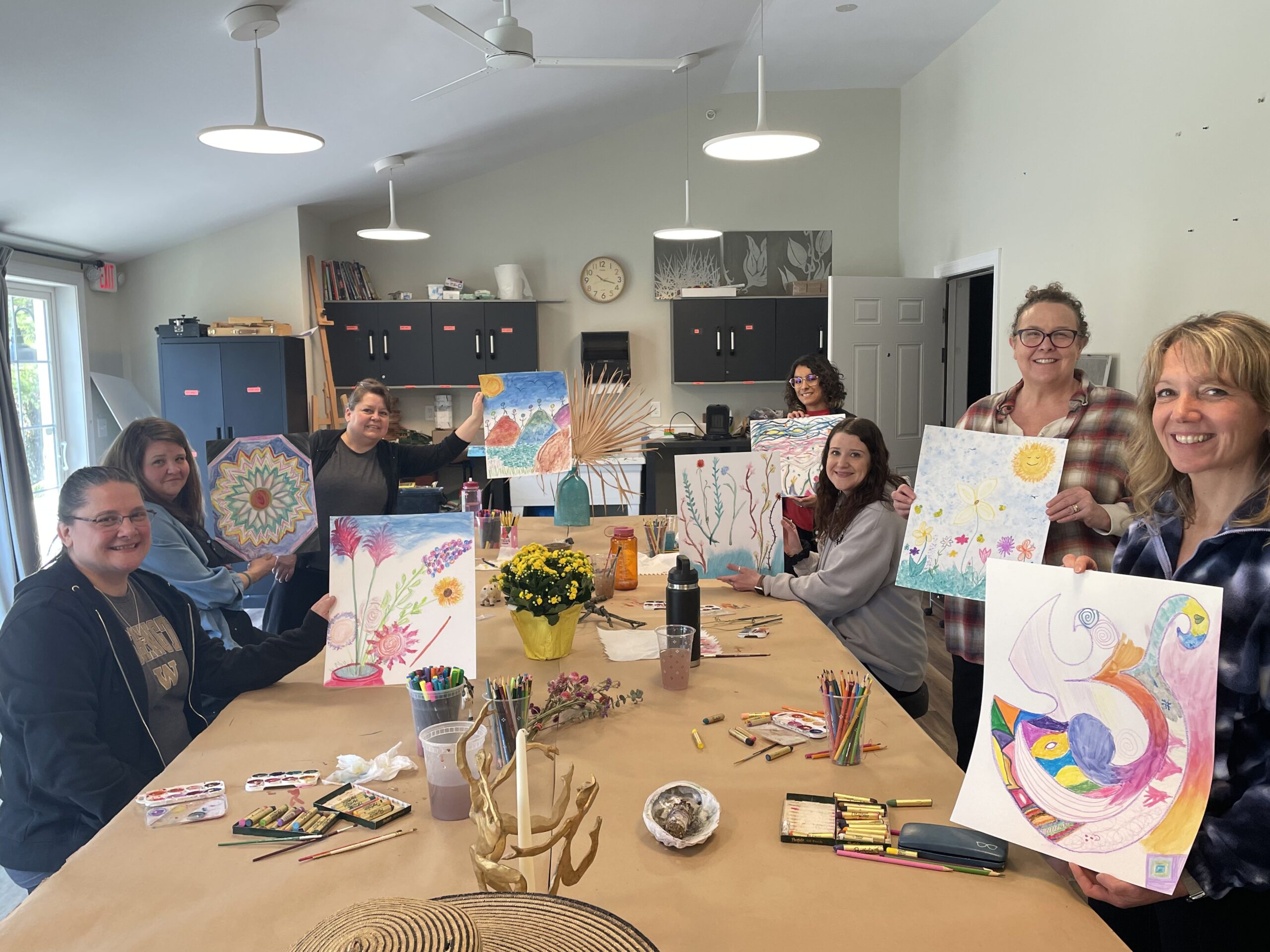 The Imagine bereavement women’s group broke into two sections: mothers mourning the loss of a child and women mourning the loss of their partner. Here, the power of sharing the complexities of grief, often unspeakable in ordinary day to day contexts, yielded powerful healing. They then united over an art experience in which they were invited to play with watercolor, a medium of fluidity allowing for joyful freedom of releasing control.  This was followed by nature bathing in which participants grabbed a yoga blanket and withdrew to a grove of cherry trees to rest, release and receive peace.